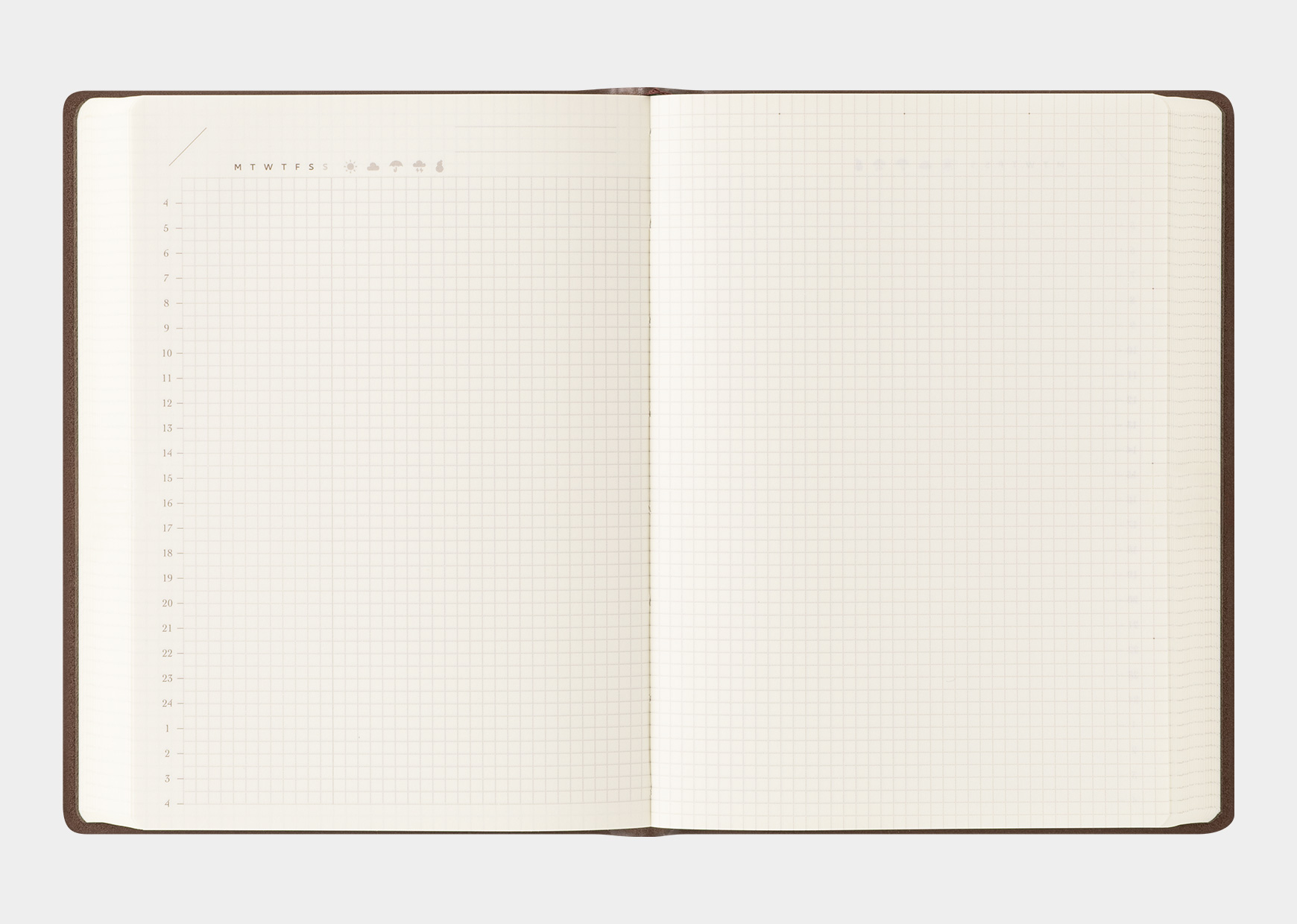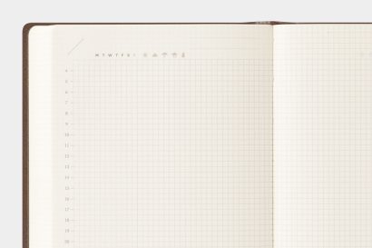 The pages include a variety of useful formats—such as a 24-hour vertical timeline, weather icons, and subtle guide lines and dots that make it easy to organize different types of writing—so you can enjoy recording without overthinking what to write. The 2.5 mm grid, which serves as a guide for writing, is also ideal for adding illustrations and diagrams.