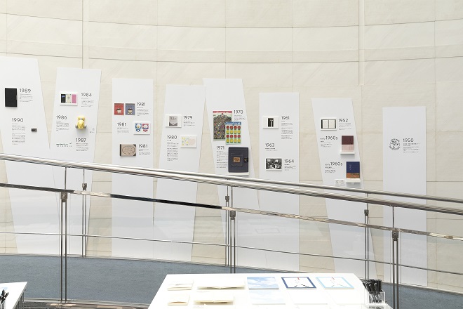 70年間の「ミドリ」の歩みを、年表のように並べました。今では貴重な過去の発売製品も一部実物を交えて展示しました。