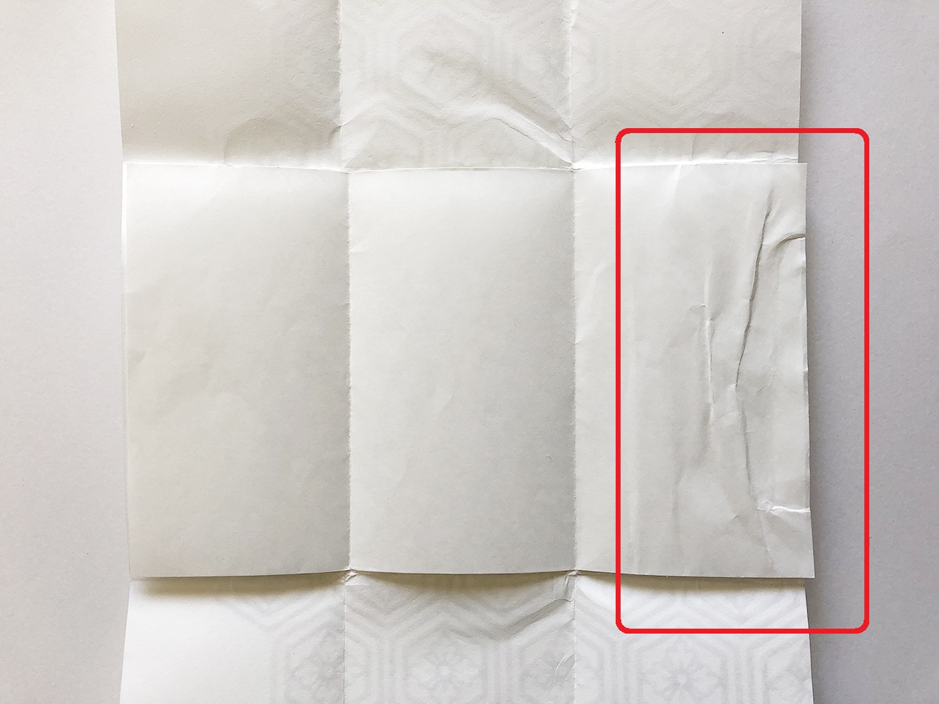本体内側にはさんだ和紙の一部に、縦方向の大きなシワが生じている。(下記写真)