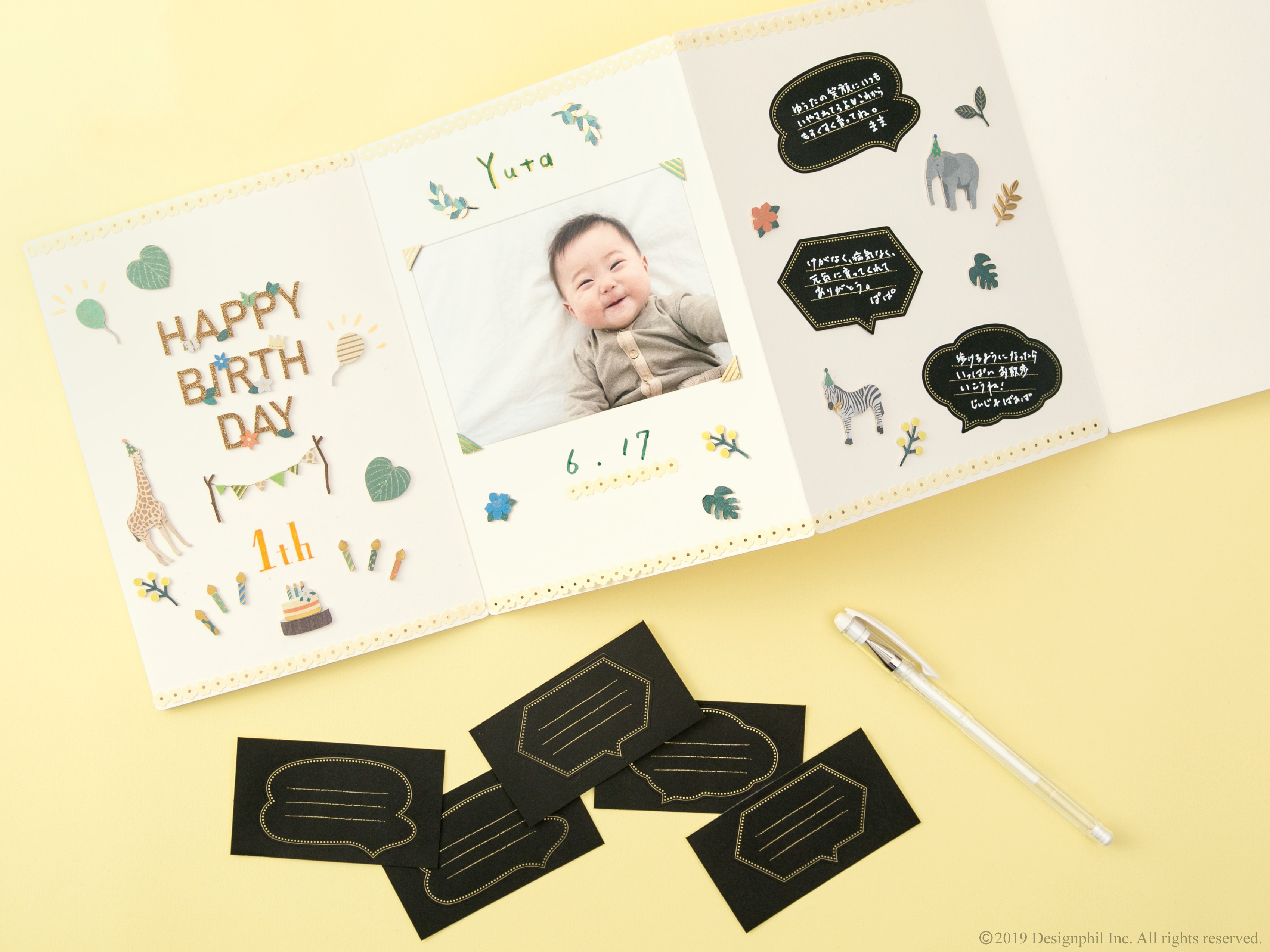 誕生日 動物柄:海外のパーティをイメージした、動物がお祝いしている柄です。子供のアルバムに使うと賑やかで可愛らしいデザインに仕上がります。