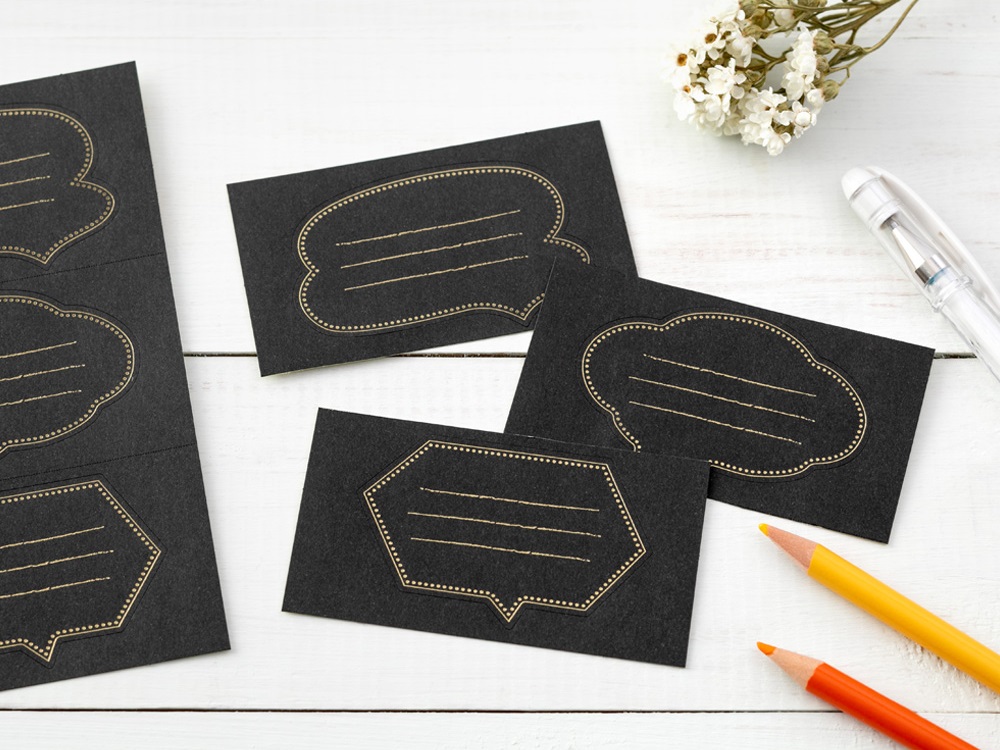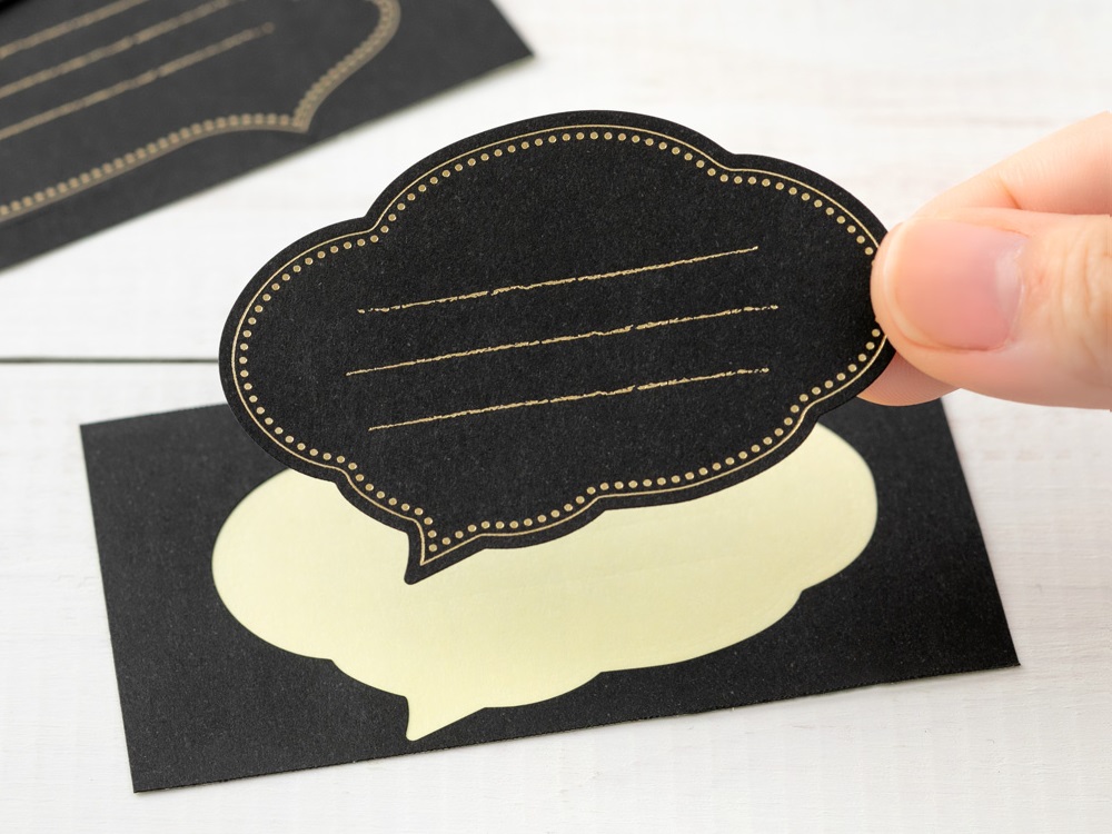 ギフトやアルバム、色紙などにメッセージを添えたいときにオススメの『ラベルシール』。このラベルシールで人気のふきだし柄に、黒色のラベルがラインアップに加わりました。