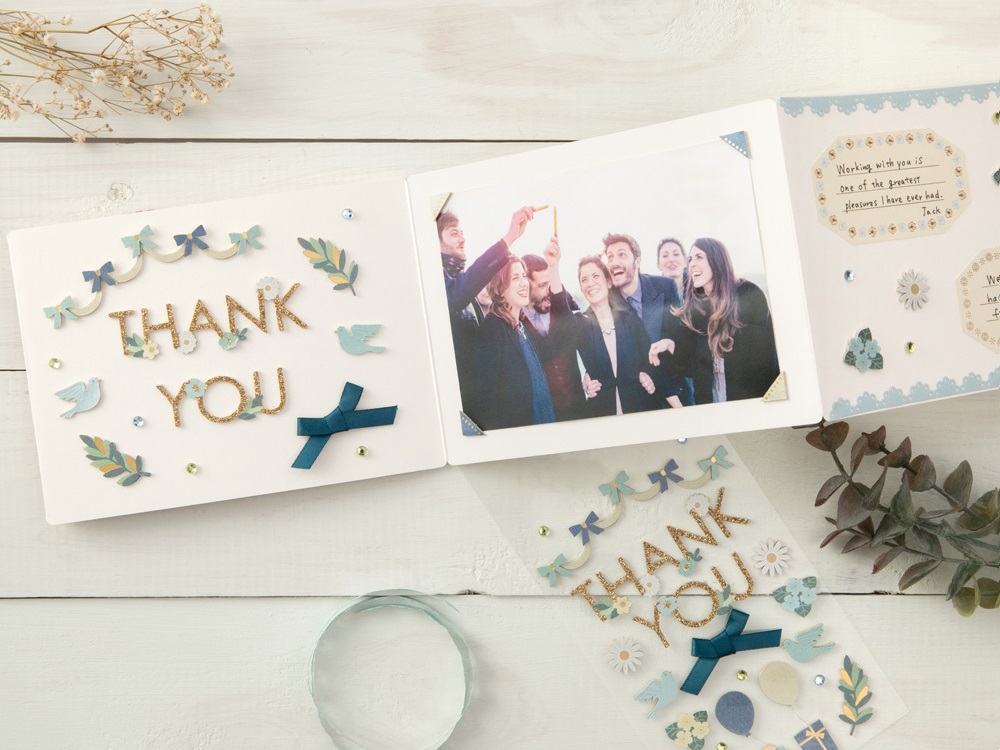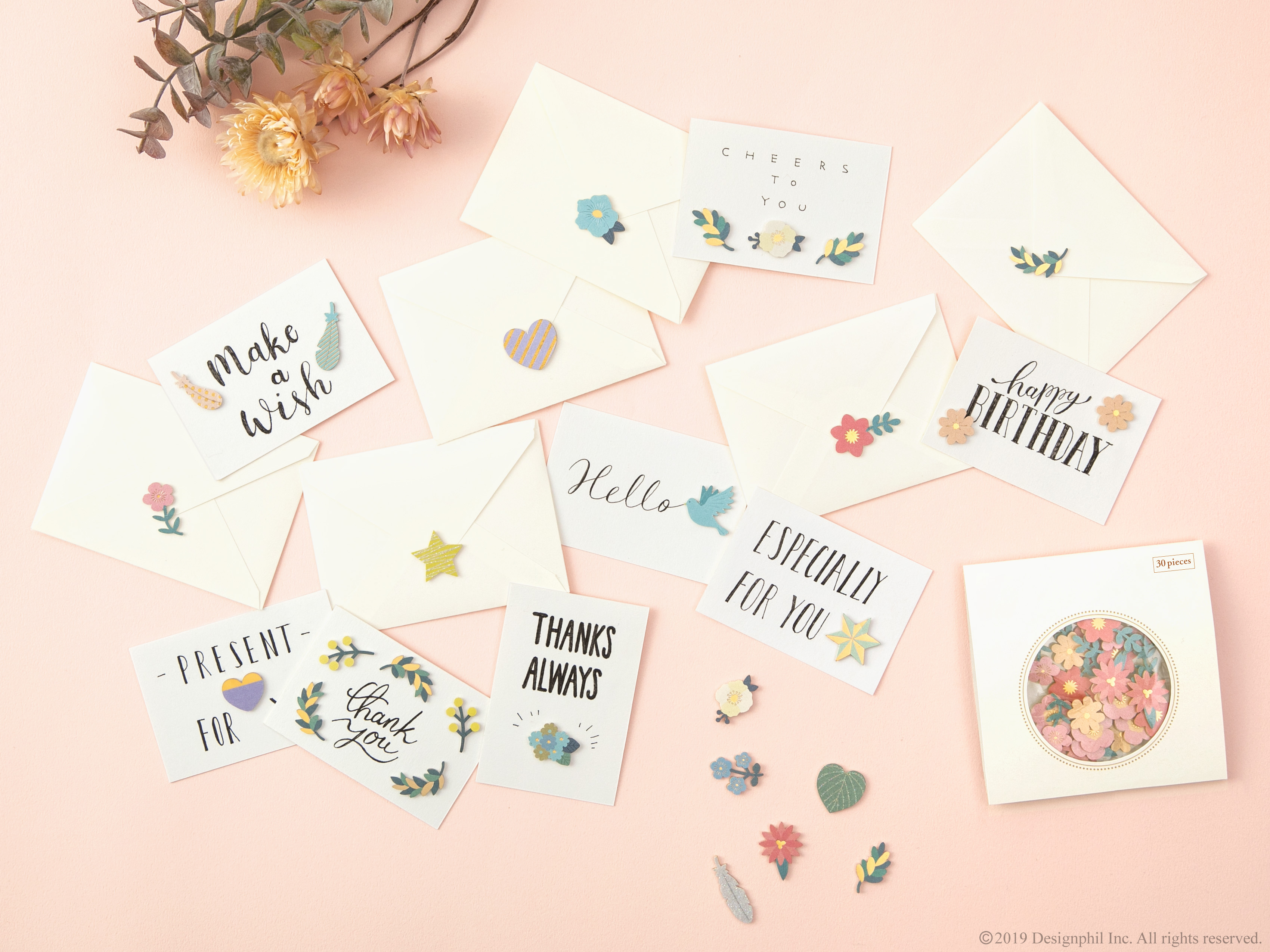 新柄として、結婚式や誕生日といった記念日、ありがとうといったお祝いの気持ちを伝えるシーンで大切な方への贈り物を華やかに仕上げる4種類がラインアップに加わりました。「Happy Wedding」「Happy Birth Day」「Thank You」といったタイトルとなるシールに、それぞれのシーンを象徴するモチーフがセットになっています。また、タイトルのシールは、単語で分かれているので、レイアウトの自由度が広がりました。写真をとめるコーナーシールつきで、写真と組み合わせてもお使いいただけます。贈り物を手作りすることが好きな方はもちろん、デコレーションが苦手な方でも気軽にお使いいただけるアイテムです。