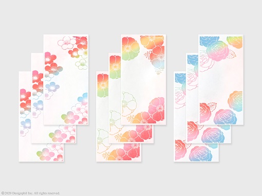 透かし加工を生かしたデザインが美しい祝儀袋『結婚祝 華色透かし』が新登場。金封全体に透かしの加工で花を描き、裏面に華やかな色味を印刷することで、表から見たときに花のシルエットが柔らかく浮かびあがります。裏面の印刷は赤や青、緑などカラフルなグラデーションにしているため、表面では色とりどりに咲き誇る花々をお楽しみいただけます。デザインは、新たな門出にふさわしい「梅柄」、「アネモネ柄」、「バラ柄」の3柄をご用意しました。