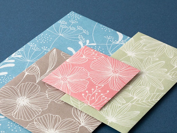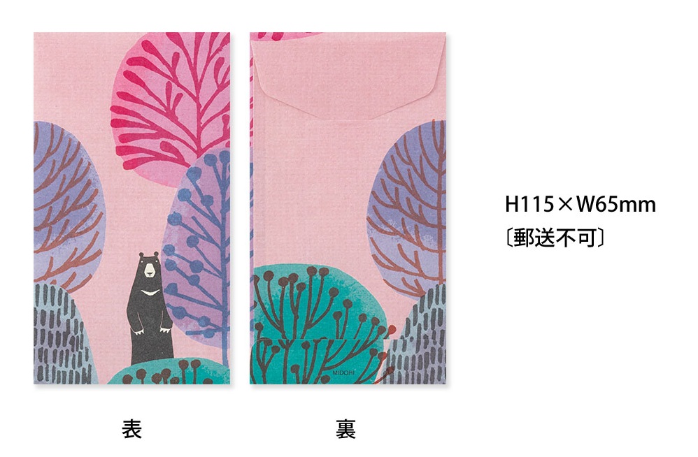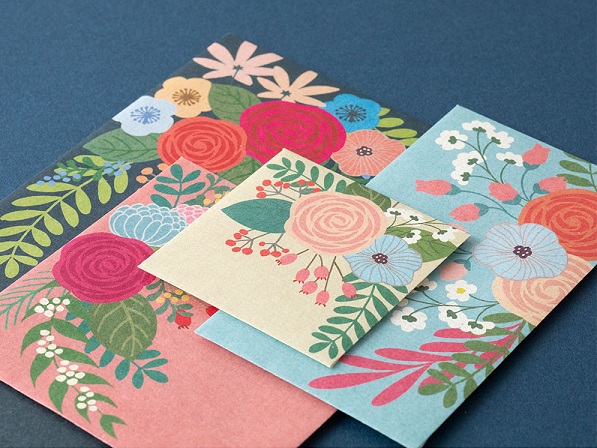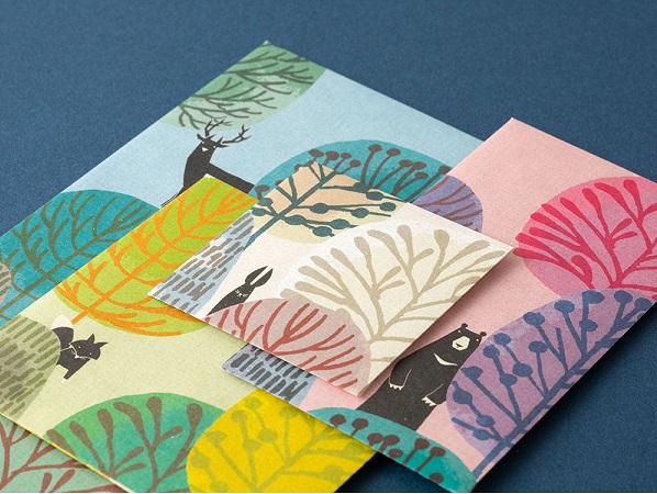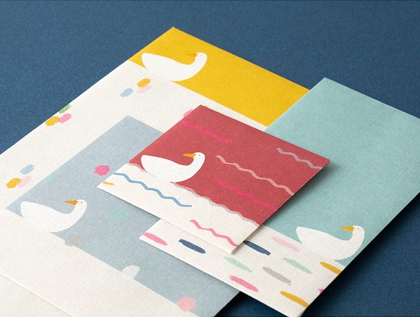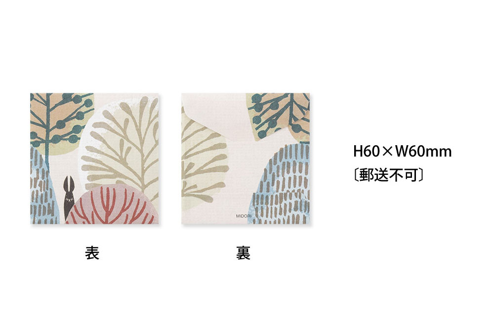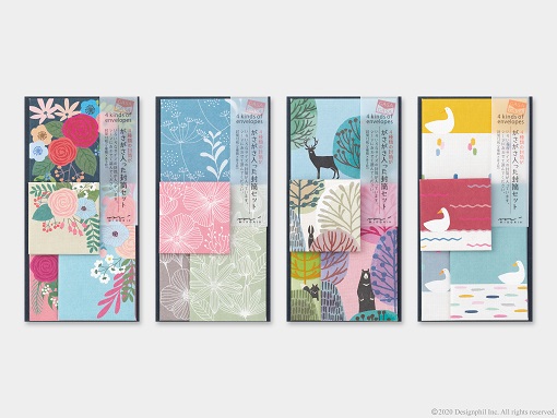 B5サイズの便箋が三つ折りで入るサイズから、500円玉や切手などの小物などを入れる際にぴったりの小さなサイズまで、4種類の封筒が各3枚、計12枚入っています。花や動物など身近なモチーフをデザインした「ブーケ柄」「草花柄」「森の動物柄」「アヒル柄」をご用意しました。