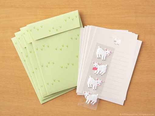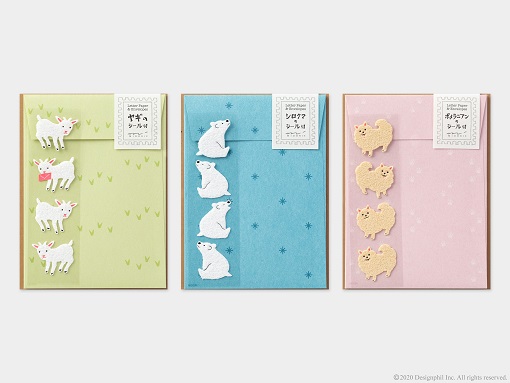 『シール付 レターセット』は、折らずに封筒に入り、ほどよい文量の一筆箋感覚で使える小さな便箋と、L判写真も入る封筒のセットです。封緘(ふうかん)シールとしても、ワンポイント用としても使える、ふわふわした動物のシールが魅力の本製品のラインアップに、 「ヤギ」「シロクマ」「ポメラニアン」の3 種類の動物が加わりました。いずれの新柄も動物たちの愛らしいシールに、受け取る人も思わず笑みがこぼれるレターセットです。