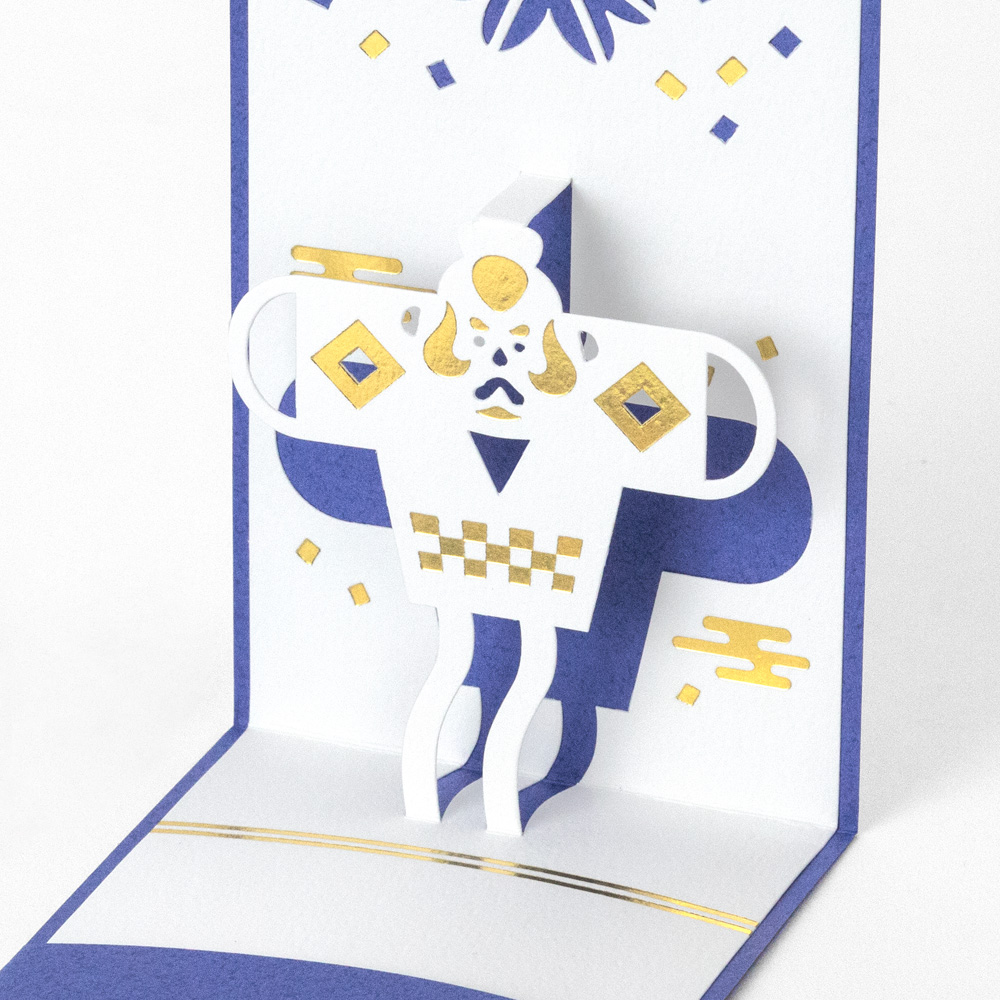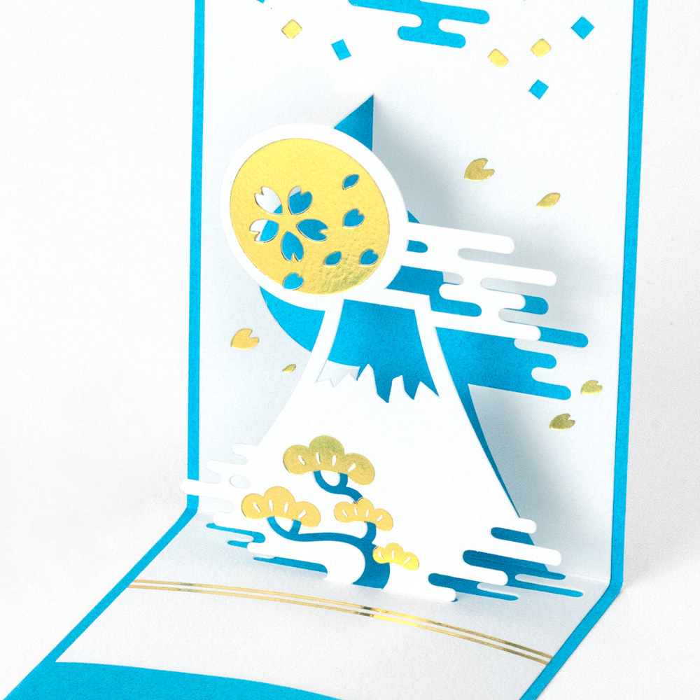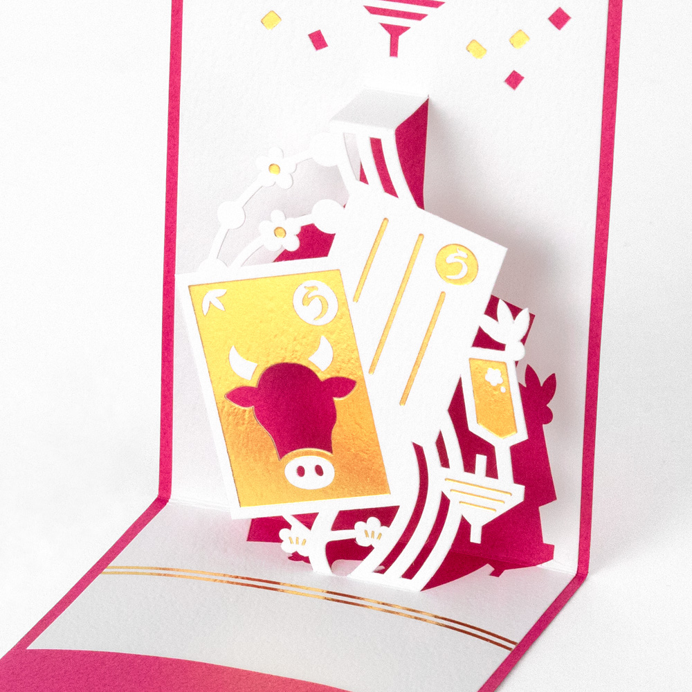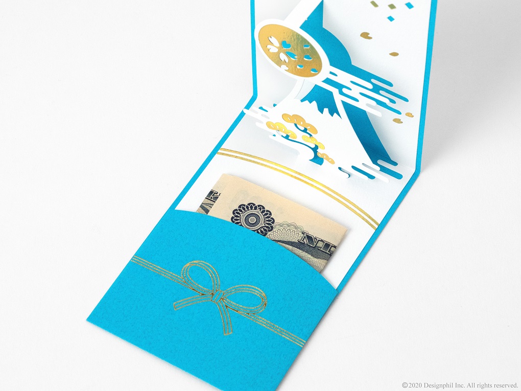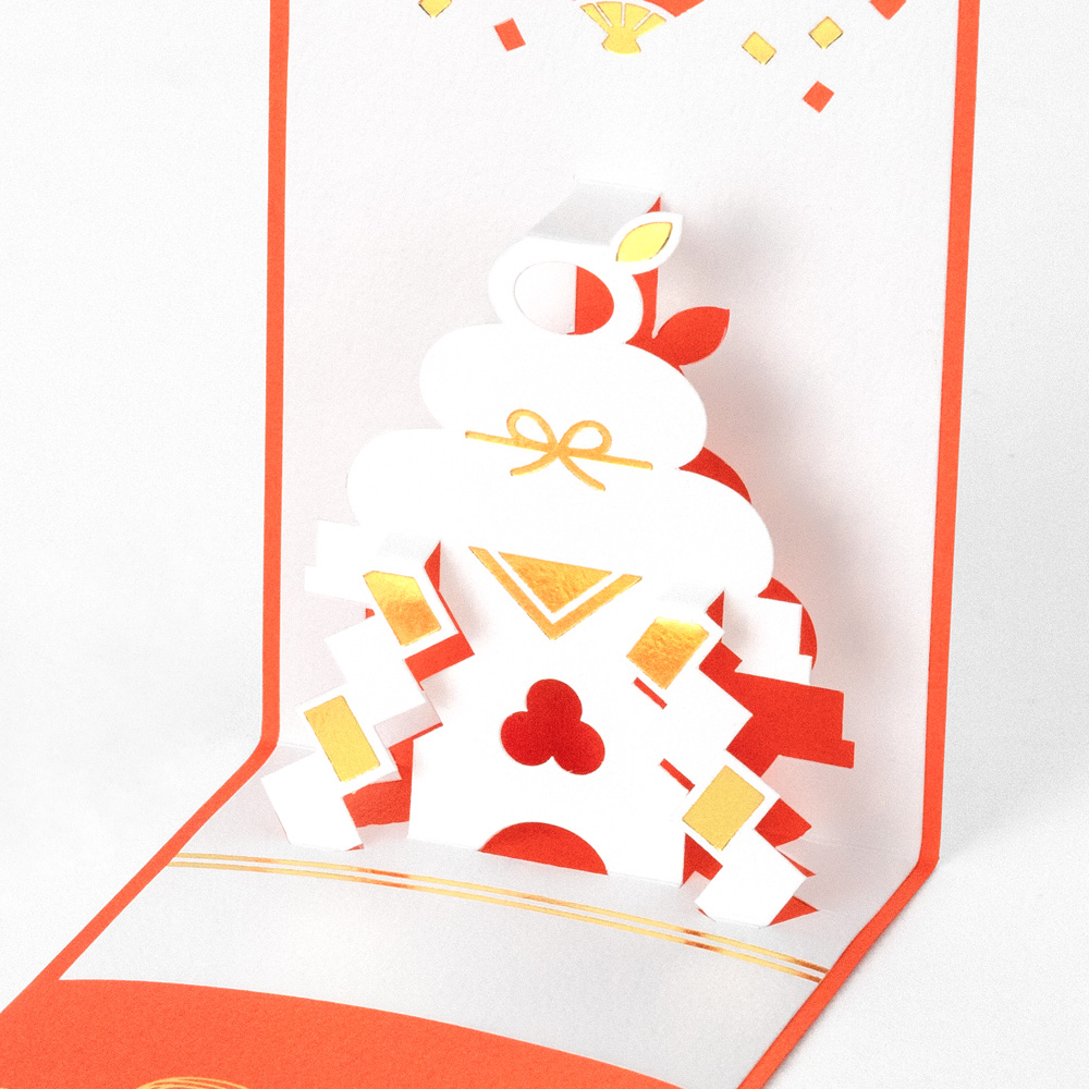 『ポップアップぽち袋』は、開くとお正月らしいモチーフが飛び出すポップアップタイプのカードと、封筒のセットです。ポップアップならではの紙の陰影や色の重なりが、開いたときの驚きやお正月の華やかさを演出します。カードの下部分にはポケットが付いており、三つ折りにしたお札を3枚まで入れることができます。