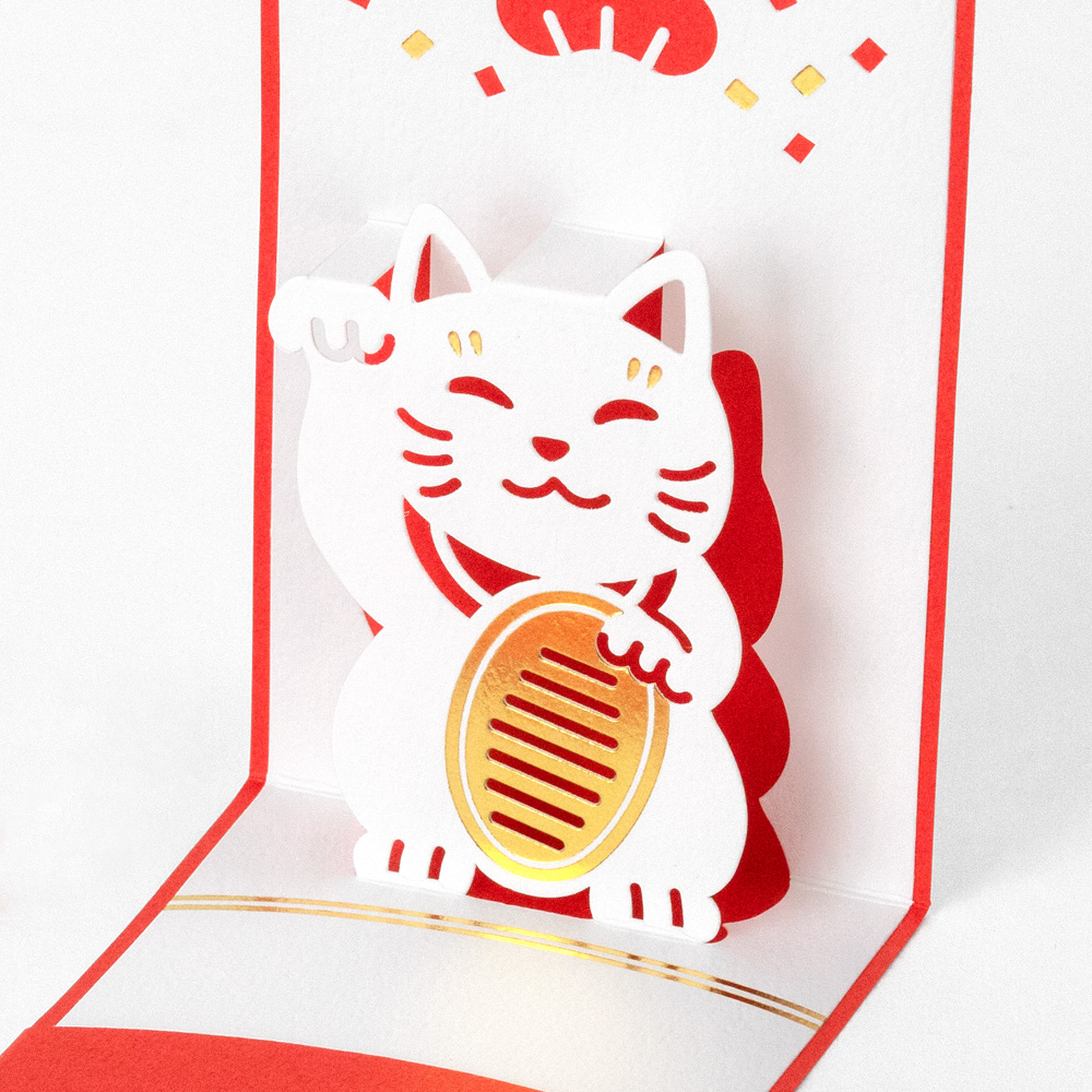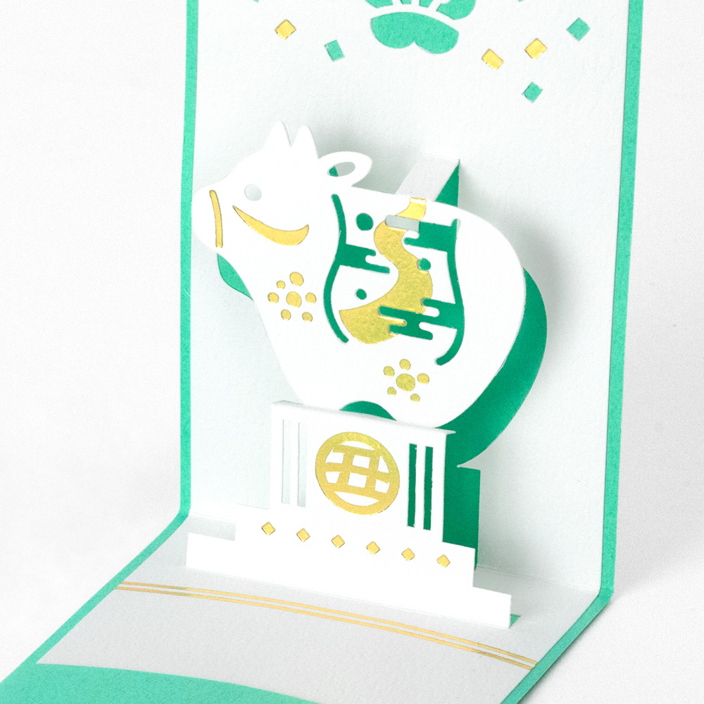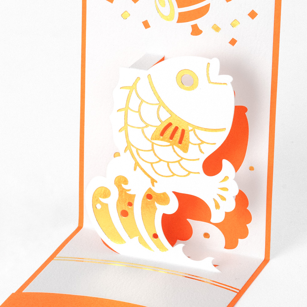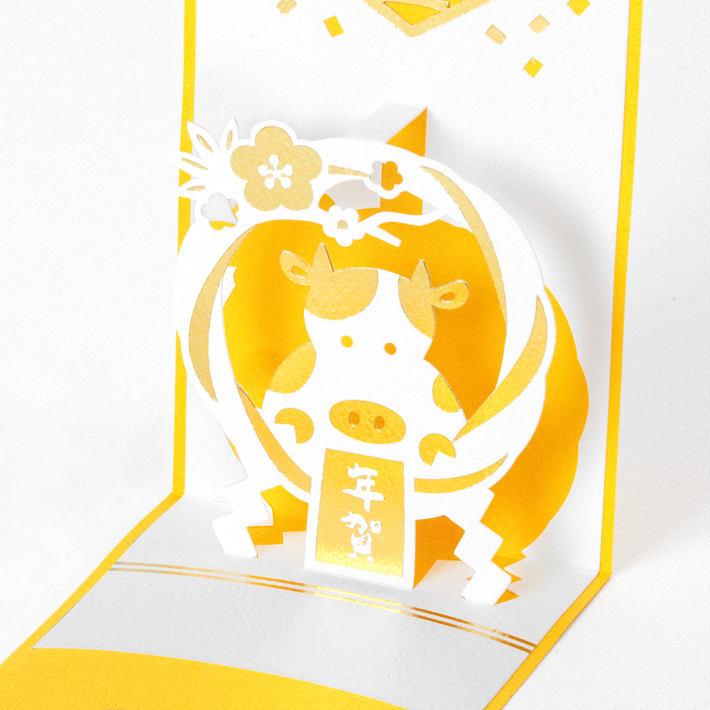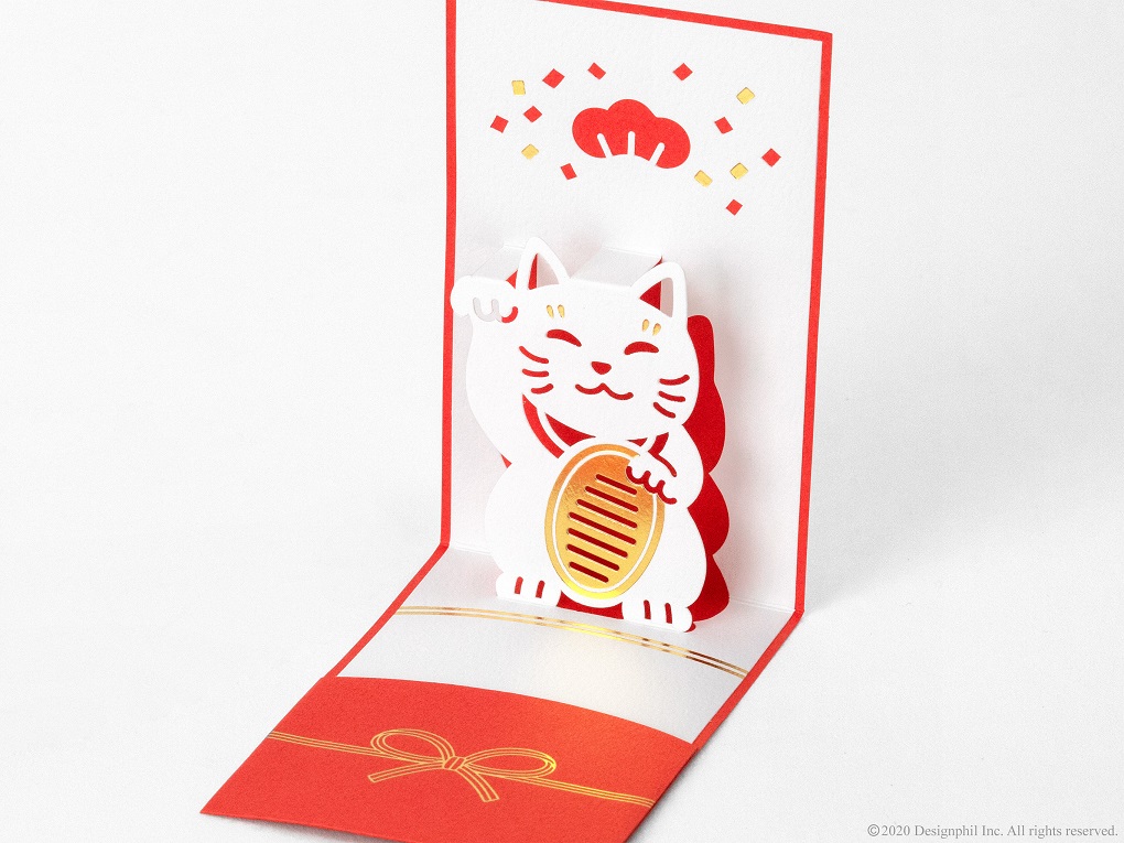 『ポップアップぽち袋』は、開くとお正月らしいモチーフが飛び出すポップアップタイプのカードと、封筒のセットです。ポップアップならではの紙の陰影や色の重なりが、開いたときの驚きやお正月の華やかさを演出します。カードの下部分にはポケットが付いており、三つ折りにしたお札を3枚まで入れることができます。