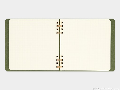 スタンプが押しやすいように、しっかりと開くリング製本を採用。スタンプを押したり文字を書いたりする際に指があたって邪魔にならないよう、リングをノートの上部と下部のみにし、中央のリングを取り除きました。