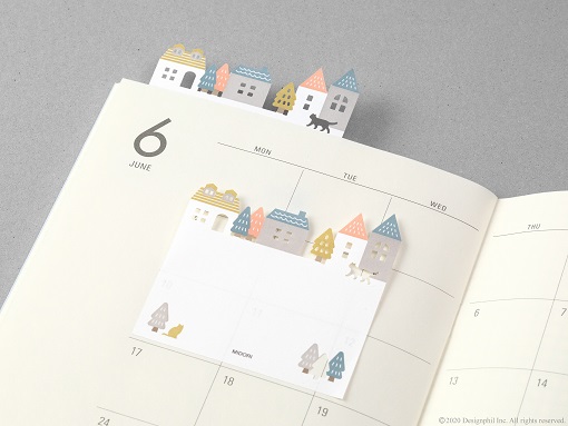 『型抜き付せん』は、細かな抜きの加工を施した付せんです。精巧な型抜き加工を施し、風景や花のデザインを丁寧に表現しました。本体の下部分に糊が付いているため、使用時は抜きの加工部分が少しだけ浮き、ほのかな陰影を楽しむことができます。