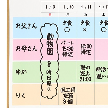 月間ブロックカレンダーとホワイトボードをそれぞれ4分割に色分けをしており、家族4人までの予定が書き込めます。各自の予定を色別にすることで、ひと目で全員の予定を把握することができます。