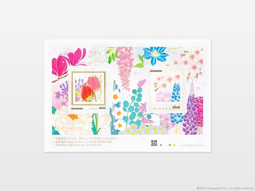 15周年を記念して作成した、63円と84円がセットになったオリジナル切手シート『切手 季事』。百花繚乱を描いた特別なデザインです。