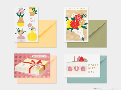 開くことでデザインの変化を楽しめる窓付きのカードです。カードの表紙に抜きの加工を施し、閉じた状態と開いた状態で異なるデザインを楽しむことができます。花束の絵柄を開くと一面のお花畑が見えたり、お皿に乗ったケーキの絵柄を開くと明るく賑やかなパーティの様子が見えたりと、カードを開くことでストーリーを感じることができる全4柄のラインアップです。