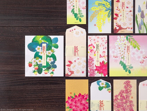 「紙シリーズ」は、四季折々の花々と季節のうつろいを大胆な構図でデザインした、和紙の便箋と封筒のシリーズです。今回、満開の花に匂いたつ春をイメージした柄が登場。便箋、封筒、一筆箋の定番商品に加え、年始、早春の様々な便りを華やかに彩るポストカードを揃えました。