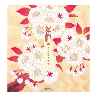 由緒ある寺や屋敷の板戸に描かれている、そんな桜の一木をイメージした意匠です。白い胡粉を厚盛にして描く八重の花は力強く、そのたわわな量感あふれる様は、まさに春の盛りを謳歌する桜の姿です。白のシルク印刷で胡粉に見立てたテクスチャーは、八重桜の姿を見事に映しています。特有のハケ目がある「伊予和紙」を使用しています。 -