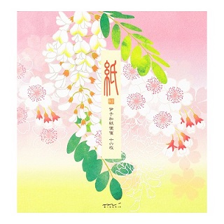 淡い色の風にのって、はりえんじゅの甘い香りが漂ってくるようです。はんなりとした淡いピンクの桜が咲く頃、ふっくらとした白い花房のはりえんじゅも盛りを迎え、あたりは優しい陽が溢れる景色にかわります。花の縁どりと、花房に施された白が美しいアクセントになっています。特有のハケ目がある「伊予和紙」を使用しています。