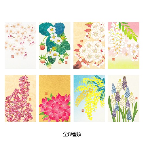 風合いのある越前和紙に、金色と白のシルク印刷を施し、春の花々を彩り豊かに表現したポストカードを揃えました。年始、早春の様々な便りにお使いいただけます。