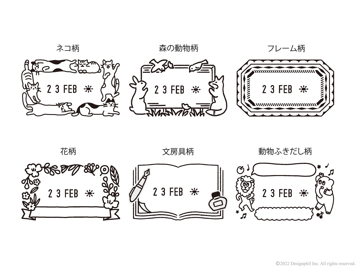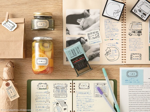 フレームのデザインは、全体が柄になっている「ネコ柄」「森の動物柄」「フレーム柄」と、柄に書き込めるタイプの「花柄」「文房具柄」「動物ふきだし柄」の計6柄。誕生日や大切な記念日、旅やお出かけをした日など、お使いのノートや手帳を楽しく彩るスタンプです。