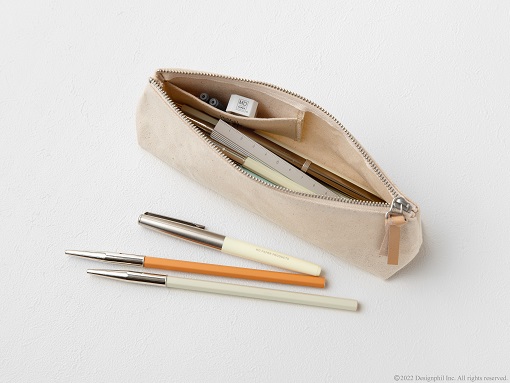 すっきりとした佇まいで、『MDノート』に似合う愛用の鉛筆や万年筆の収納にもおすすめです。本体には、古くから帆船の帆やトラックの幌にも使われてきた、無垢な質感が魅力の倉敷帆布を使用。ロウ引き加工を施した生地は撥水性に優れており、使い込むほどに味わいが増して柔らかく手に馴染みます。