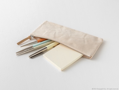 万年筆やペン、鉛筆など、筆記具5~6本を入れるのにちょうどいいフラットなマチなしタイプ。フラットで幅があるので、好評発売中の『MD付せん』を一緒に入れるのにもぴったりです。万年筆の予備のカートリッジや鉛筆削りなどの小物が入る便利な内ポケットが付いています。
