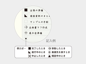 ToDoリストの四角いマスには、進行状況をマークで記載することで、優先順位をつけたり、タスクを翌週に移動したりと、全体を俯瞰しながらよりスマートに管理することができます。