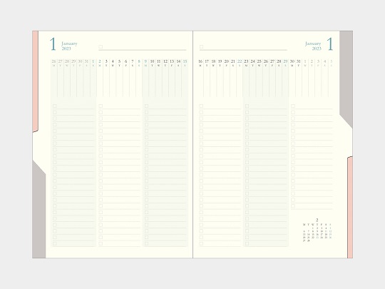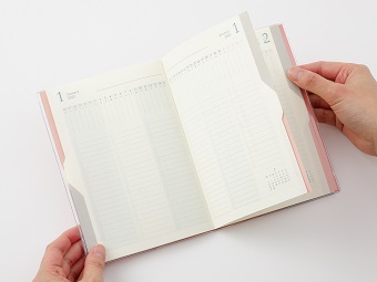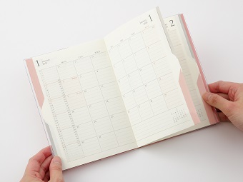 月間ブロックタイプのスケジュールページと、同じ月のToDoを1週間ごとに管理できるページを、それぞれ見開きで交互に設けています。押さえる位置で開くページが変化する「マジックインデックス」(※)を採用し、「予定」と「ToDo」それぞれを簡単に検索することができます。赤のインデックスを押さえるとスケジュールページのみが、グレーのインデックスを押さえるとToDoページのみが開き、また、赤とグレーの間にある白のインデックスを押さえるとスケジュールとToDoページが交互に開く、必要なページのみをすぐに検索できる仕組みです。