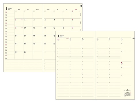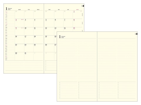 1ヵ月の予定を見渡せる人気の月間ブロック。各月の次ページには当月のミーティングの記録やアイデア、情報などを書き込むことができる、ToDoリストと見開き横罫メモページ付き。予定をミニマムに管理したい方や移動が多い方におすすめ。