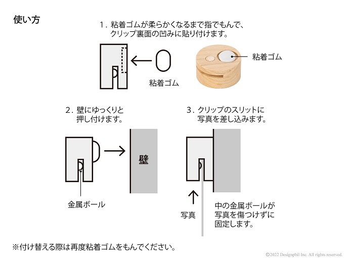付属の粘着ゴムでクリップ本体を壁に貼り付け、スリット部分に写真やカードを差し込む、新しいタイプのインテリア用クリップです。柔らかい粘着ゴムを使用することで、壁に穴を開けたり傷をつけたりせずに飾ることができます。粘着ゴムは、揉み込むと繰り返しお使いいただける点もポイントです。また、クリップのスリット部分内側にはバネと球を内蔵。写真やポストカードなどを傷つけず、簡単に抜き差しができる仕組みを実現しました。壁にピンなどを刺せない賃貸物件でも、安心してお楽しみいただけます。リビングや寝室の壁を飾りたいときはもちろん、キッチンでマグネットが付かない場所にメモやレシピを貼っておきたいときにもおすすめです。