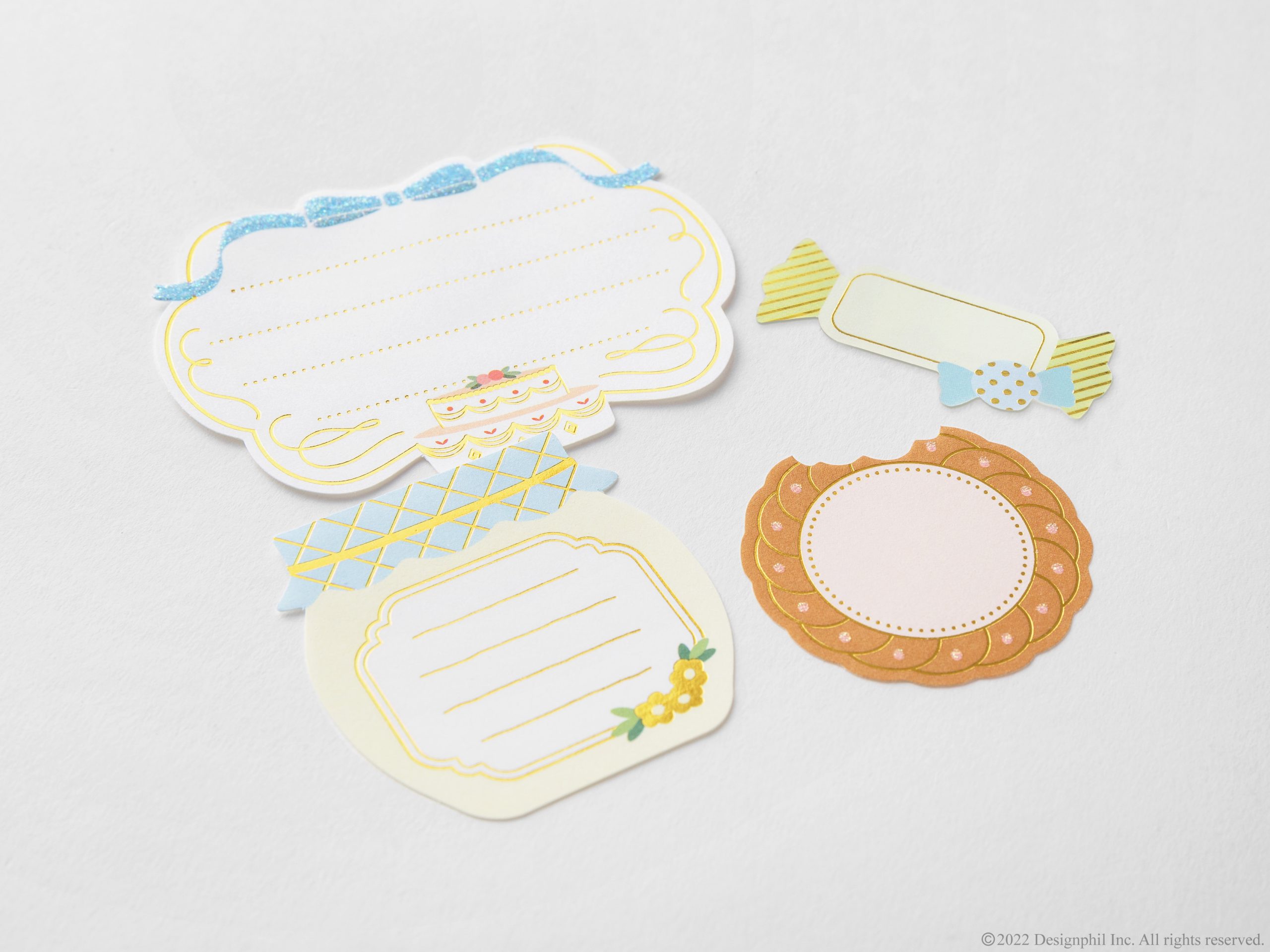 細かい抜きや箔押しなどで、華やかな加工が施されたフレークタイプのラベルシールです。メッセージやタイトルを書き込めるシールで色紙のデコレーションにはもちろん、ちょっとしたプレゼントに一言添えたい時やノートやアルバムの表紙のワンポイントなど、さまざまなデコレーションが楽しめます。