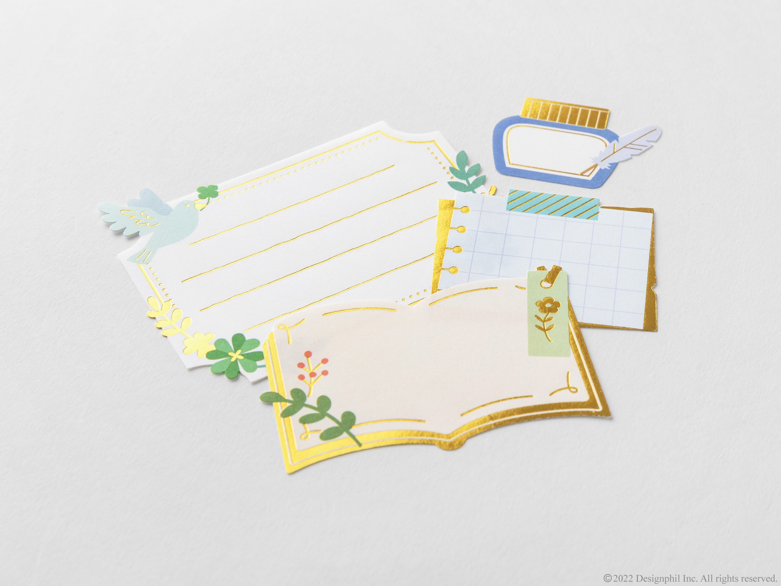 本やインク瓶などをモチーフにしており、ノートのタイトルデコレーションや手帳とも相性の良いデザインです。