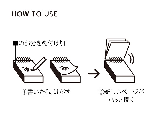 『パッとメモ』は、左側面をペーパーパッドのように糊付けし、未使用のページがすぐに開くメモです。使用済みのページはパラパラとめくれる一方、未使用のページは綴じられたままになり、次にメモを開くときに新しいページを探す必要がありません。片手がふさがっているときにも便利に使え、潜在的に感じていたリングメモの不満を解決した製品です。2019年の発売以降、ビジネスパーソンをはじめとした多くの方にご好評をいただいています。また、2020年にはグッドデザイン賞も受賞しました。