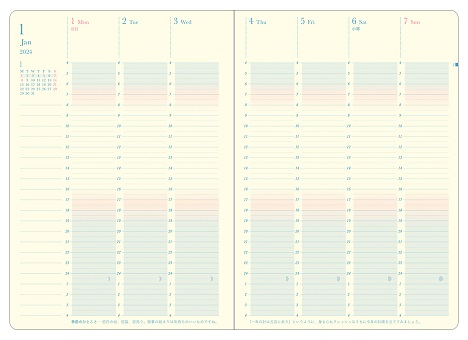 朝から夜までの日の長さを淡いカラーのグラデーションで表現した、24時間見渡せるバーチカルタイプの週間ページのフォーマットです。ページをめくっていくと、日の出、日の入りを表現したグラデーションが少しずつ変化し、日の長さの変化と共に季節の移ろいを感じることができます。