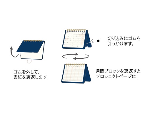ページを開いて、ゴムバンドを表紙の切り込みに引っかけるだけで簡単に立てることができます。使わないときは、たたんで表紙をゴムバンドで留めることができるため携帯性にも優れています。テレワーク中心のワークスタイルの方はもちろん、自宅と職場を行き来しダイアリーの持ち運びが多い方にもおすすめです。
