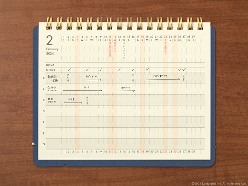 フォーマットは、1ヵ月の予定を把握しやすい月間ブロック。立てた状態で裏返すと、複数案件の進行に便利なプロジェクトページに早変わりするため、用途に応じて使い分けることができます。その他にもたっぷりと書き込みできるメモページや、今月の目標やToDoが12ヵ月分書き出せる付録ページなど、ビジネスに最適なフォーマットが充実しています。プロジェクトページには、テレワークかオフィスワークかをチェックする欄もついており、予定の把握や行動の記録などにも最適です。