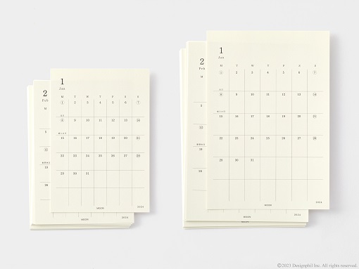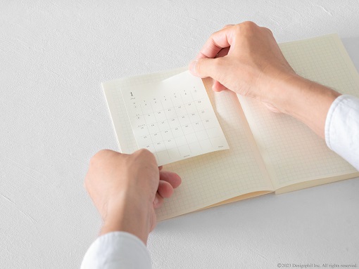 『MDダイアリーシール』は、月間ブロックダイアリー14ヵ月分(2023年12月~2025年1月)と年間カレンダー(2024年、2025年)の計16枚がセットになったシールタイプのダイアリーです。書く場所やページ数を気にすることなく、ノートの好きなページに貼って使ったり、『MDノートライト』に貼って軽快に持ち歩いたりと、自分仕様のオリジナルダイアリーとしてお使いいただけます。「MD用紙」を使用しているので、『MDノート』と一体化し、書き心地もしっかりお愉しみいただけます。
