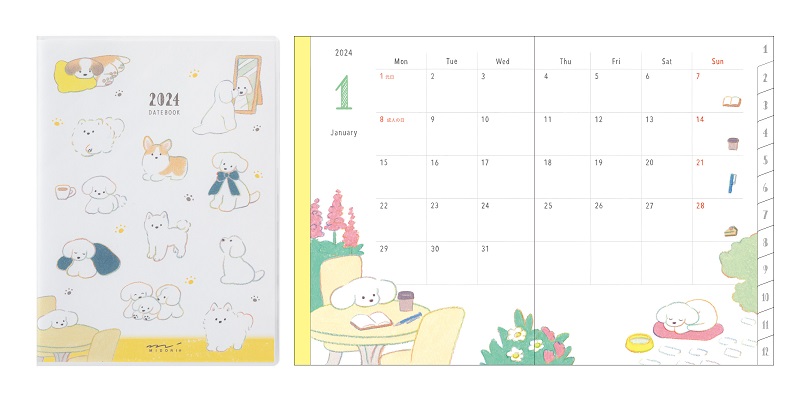 イラストレーターてらおかなつみさんによる、犬種を問わないかわいいイヌたちを色彩豊かに描いたダイアリー。2024年版はイースター、夏祭り、芸術の秋など季節ごとのシーンに新しいモチーフを盛り込みました。