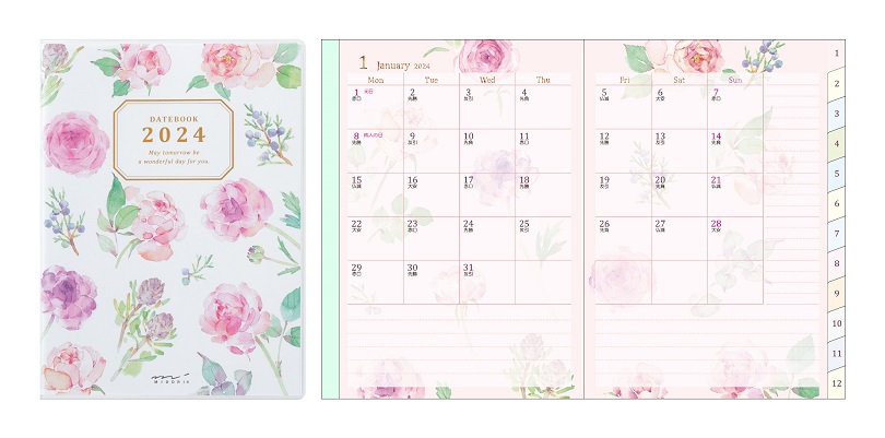 ダイアリーを彩る花は、イラストレーターの黒岩多貴子さんによるもの。2024年版も引き続き、季節の花をテーマにしています。今回はオールドローズをはじめ、オレンジ色のチューリップやクレマチス、ペチュニア、秋バラにもスモークツリーや秋色紫陽花をあしらった、季節を感じるブーケをイメージした新柄が入ります。
