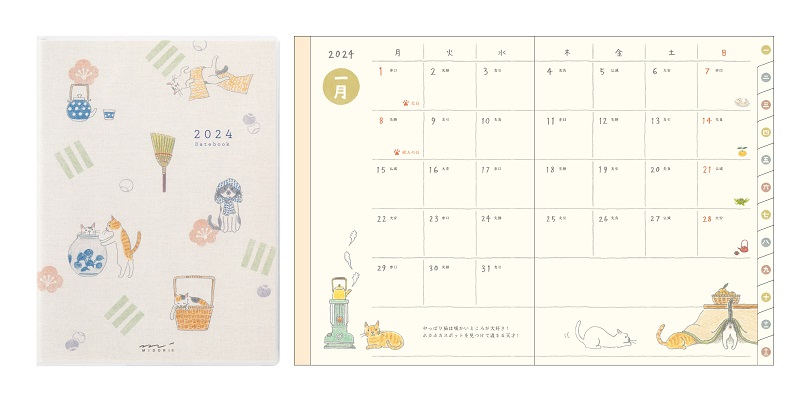 イラストレーター小泉さよさんが柔らかなタッチで描く猫たちのイラストとコラムが魅力のダイアリー。2024年版のテーマは、「和の暮らしとネコ」。季節ごとの日本の風景や行事と絡めて、ほっこり癒されるネコとの暮らしを表現しました。