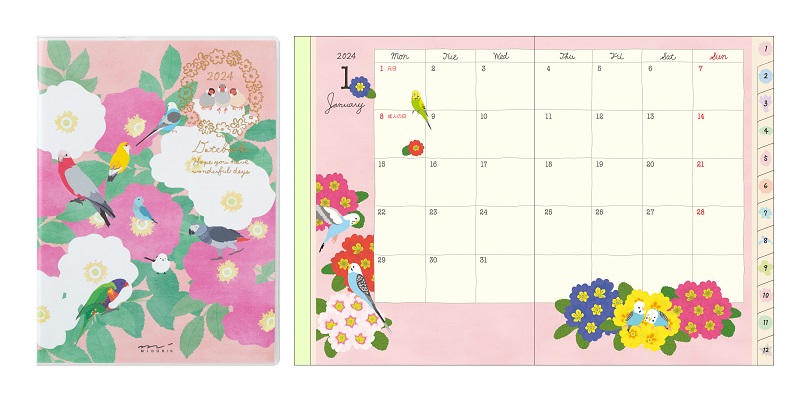 トリと季節の植物の癒しのデザインが楽しめるダイアリーです。毎月季節にあった植物を選び、それに合わせてトリたちが楽しそうに遊んでいたり、おしゃべりしていたりするようなシーンが描かれています。今年も色とりどりのトリたちと鮮やかな植物のデザインで、毎日に彩りと癒しをお届けします。