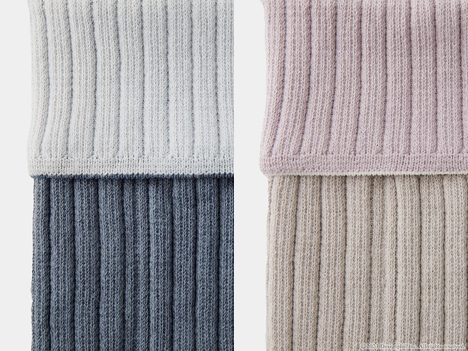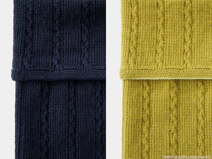 ニット素材ならではの風合いを生かした、温かな印象のケーブル編み(紺、黄色)と、シンプルなリブ編み(ツートーン薄紫、ツートーン水色)から、お好みに合わせてお選びいただけます。いずれも、落ち着きのある優しい色味が魅力です。