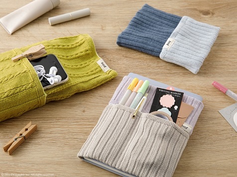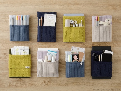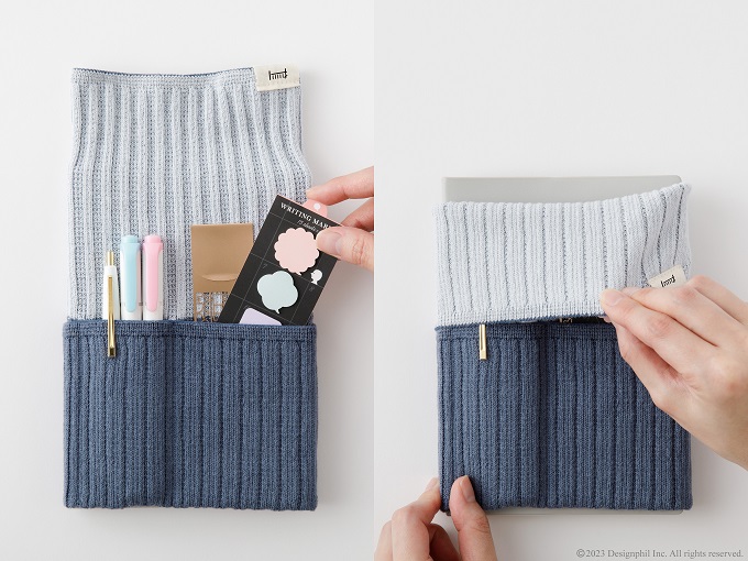 生地は、丈夫な日本製の「五泉ニット」を使用しています。伸縮性があり、A6~B6サイズの手帳にお使いいただけます。手帳に取り付けて持ち運ぶ際には、本体上部のニットを折り返してポケットの上に被せることで、ポケットの中身が落ちる心配がありません。