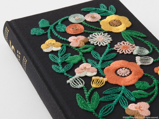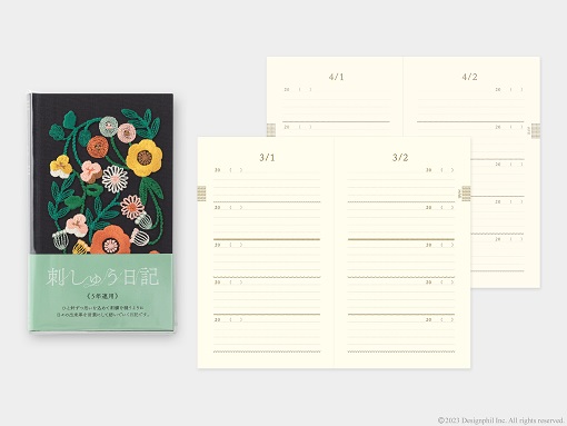 布貼りの表紙に刺繍のデザインを施した『刺繍日記』は、新色が登場します。好評発売中の草花のデザインはそのままに、表紙のベースカラーに深みのある黒が加わります。鮮やかな草花の刺繍が美しく際立ち、思わず触れたくなる繊細な質感や立体感をお楽しみいただけます。同じ日の記録を5年分一覧できる連用日記のフォーマットで、刺繍をするように言葉を紡ぎ、昨年の自分を振り返りながら日記を書くことができます。