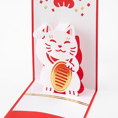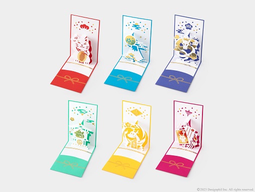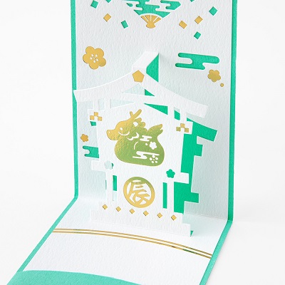 『ポップアップぽち袋』は、開くとお正月らしいモチーフが飛び出すポップアップタイプのカードと、封筒のセットです。ポップアップならではの紙の陰影や色の重なり、箔押し加工が華やかな気分を演出します。開けた瞬間に思わず笑みがこぼれるような、遊び心あふれるデザインに仕上げました。カードの下部分にはポケットが付いており、三つ折りにしたお札を3枚まで入れることができます。お年玉を贈る相手に合わせてお選びいただける全6柄のラインアップです。