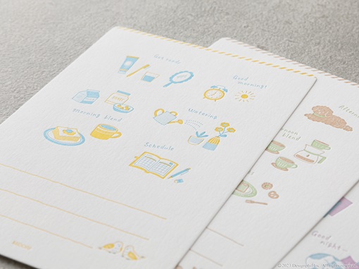 贈る相手やシーンに合わせて「モーニングブレンド」、「アフタヌーンブレンド」、「ナイトブレンド」の3種類のテイストからお選びいただけます。「パンとエスプレッソと」で人気のブレンドのほか、「ミドリ」のためのオリジナルブレンドも特別にご用意しました。メッセージカードは、それぞれのシーンをイメージしたモチーフを優しい風合いでデザインし、活版印刷で1枚ずつ丁寧に仕上げています。