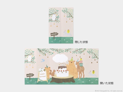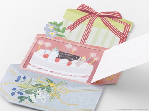 デザインの一部をめくることで、中に書かれたメッセージと隠れていた絵柄を合わせて楽しむことができるカードです。お祝いや感謝の気持ちと一緒に、カードをめくるわくわく感を届けることができます。手紙の封筒部分をめくると、たくさんの花が溢れる「手紙柄」、プレゼントの箱部分をめくると、華やかなお祝いのケーキが出てくる「誕生日 プレゼント柄」、家の窓部分をめくるとパーティーをしているクマの家族にほっと癒される「誕生日 家柄」の全3柄から、贈る相手に合わせてお選びいただけます。