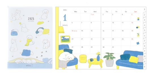 イラストレーターてらおかなつみさんによる、犬種を問わないかわいいイヌたちを色彩豊かに描いたダイアリー。2025年版はイヌと一緒に季節と日常が感じられるシーンをたくさん盛り込みました。てらおかさんが得意な風景や家の中の景色も取り入れ、シーンごとに色彩の豊かさを楽しめます。