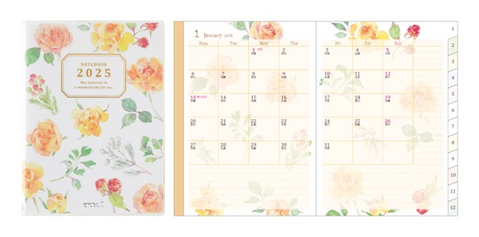 イラストレーター黒岩多貴子さんが描く季節の花を楽しめるダイアリーです。2025年版は、例年入れていたバラをアプリコット系の花に変更しました。そのほかピオニーやダウカス、ラベンダーとハーブ、ノブドウやフランネルフラワーそして大人っぽいダリアなど、季節を感じるブーケをイメージした新柄が入ります。