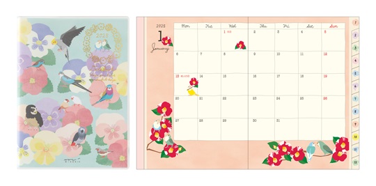 トリと季節の植物の癒しのデザインが楽しめるダイアリーです。毎月季節にあった植物を選び、それに合わせてトリたちが楽しそうに遊んでいたり、おしゃべりしていたりするようなシーンが描かれています。色とりどりのトリたちと鮮やかな植物のデザインで、毎日に彩りと癒しをお届けします。