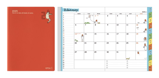 『ポケットダイアリー』は、日常を楽しく彩る手帳シリーズとして1984年に誕生しました。お好みで選べる豊富なサイズとデザインでご好評をいただき、今日まで多くの方にご愛用いただいています。共通のダイアリーフォーマットを使用している手帳が多いなか、本シリーズは、それぞれ月ごとに異なるイラストを描き起こしており、細部までこだわりが満載。フルカラーのページを開くたびに楽しい気分になれ、1年間を通して飽きずにお使いいただけるダイアリーです。お好みで選べる豊富なサイズとデザインをご用意しました。2025年版から、1月始まり~翌年3月終わりに変更し、また、1年の思い出や印象に残ったことを書き出せる「マイメモリーズ」ページも新たに加わりました。(オジサン柄は2024年版から変更済み)