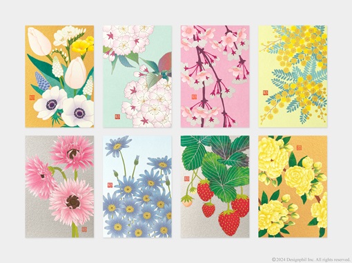 風合いのある越前和紙に、金色とプラチナ色のシルク印刷を施し、選りすぐりの春の花々や実を彩り豊かに表現しました。お年始や春のご挨拶など、さまざまな便りにお使いいただけます。