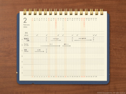 フォーマットは、1ヵ月の予定を把握しやすい月間ブロック。立てた状態で裏返すと、複数案件の進行に便利なプロジェクトページに早変わりするため、用途に応じて使い分けることができます。その他にもたっぷりと書き込めるメモページやto doリストなど、ビジネスに最適なフォーマットが充実しています。
